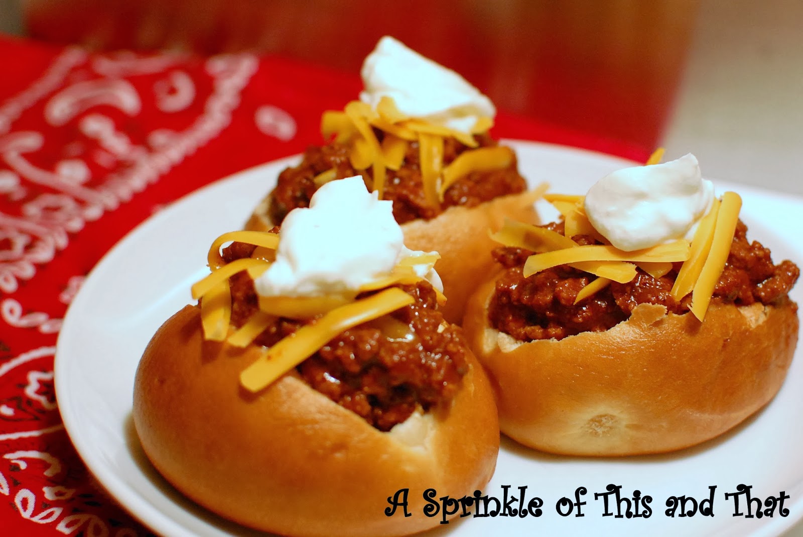 This is so simple! All you need is your favorite chili recipe, some shredded cheddar cheese, sour cream and a package of pretzel dinner rolls. You could use any dinner roll, but these in particular were "slider" size and oval shape. Don't they kind of look like footballs? Anyhow, carve out the center of the roll first. Then spoon in the chili and top with your favorite toppings. That's it. Fun...yummy...perfect Super Bowl snack food, especially considering it is so cold out there! I wonder what it will be like for the big game?