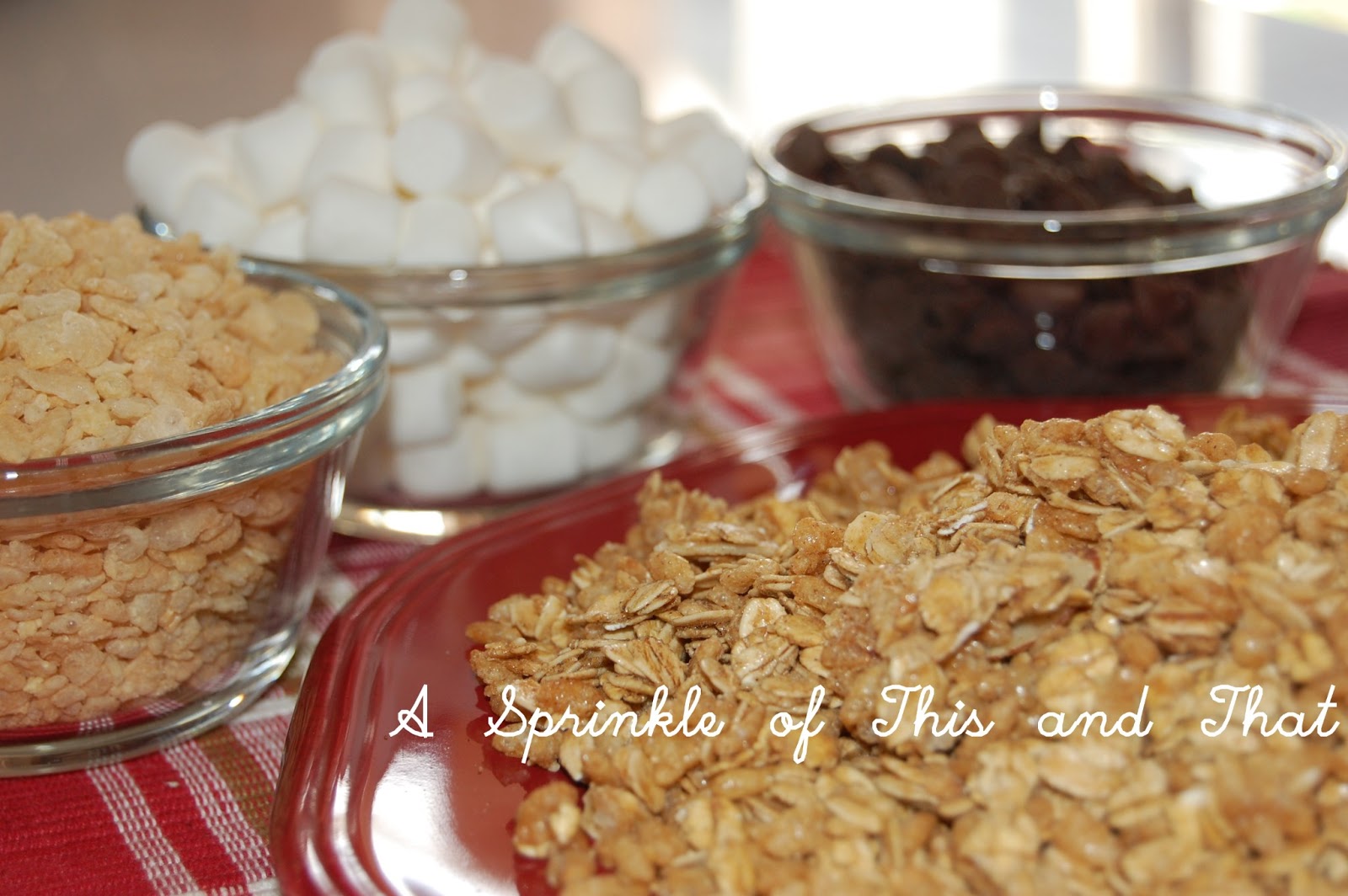 Gather the following ingredients: 1/2 stick of unsalted butter, 1/4 cup of light brown sugar, 1/4 cup of honey, 2 cups of granola, 1 cup of rice cereal, 1/4 cup of chocolate chips.